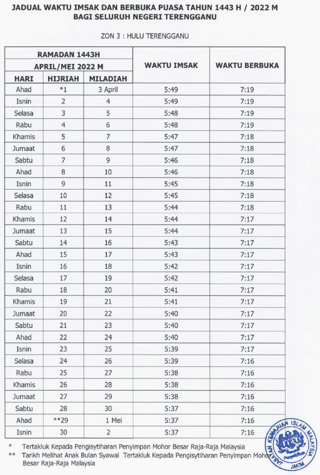 Jadual Waktu Berbuka Puasa Dan Imsak Terengganu 2022